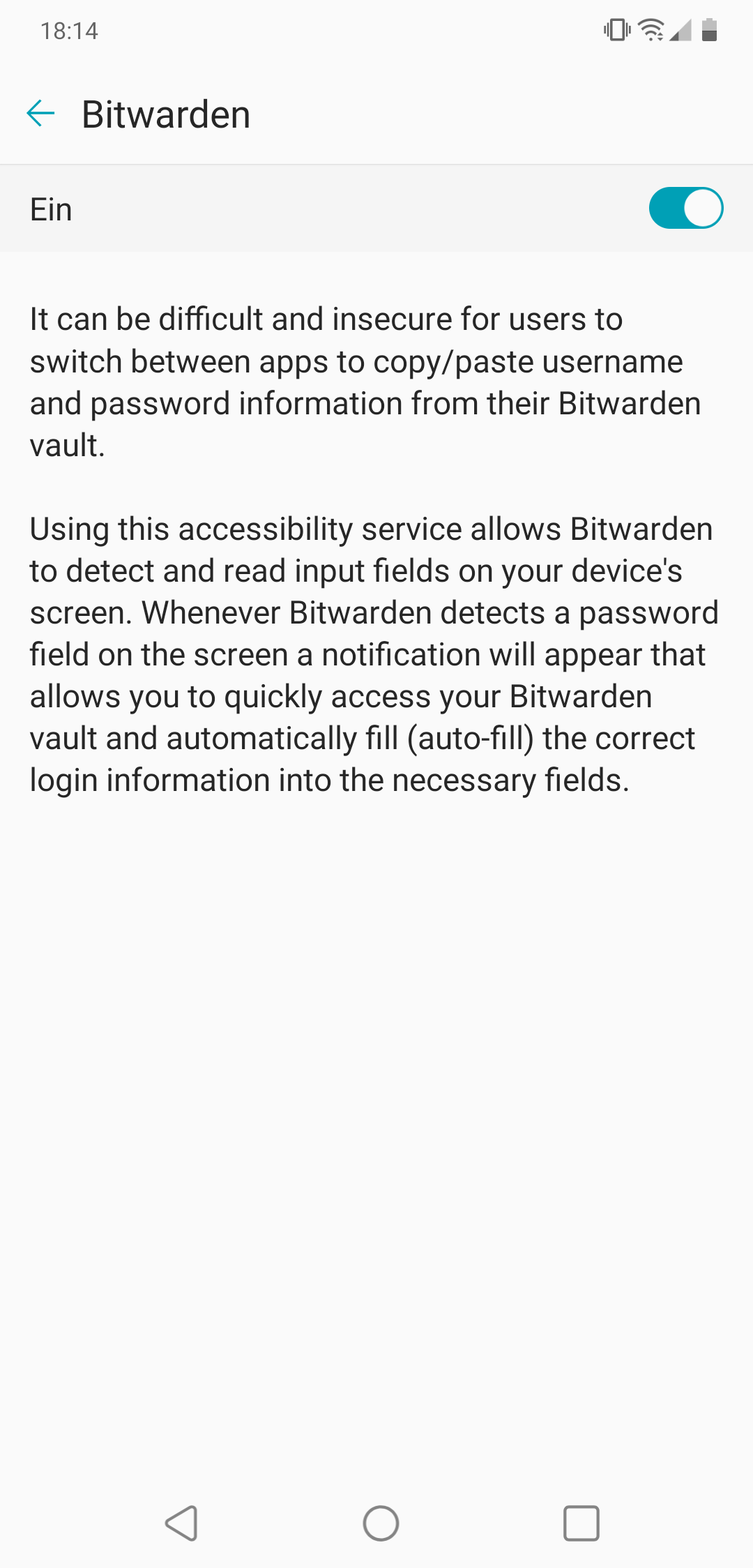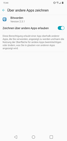 Bitwarden has the "Draw over other apps" rights. However, this does not change the behaviour, no matter whether I revoke the permission or not.