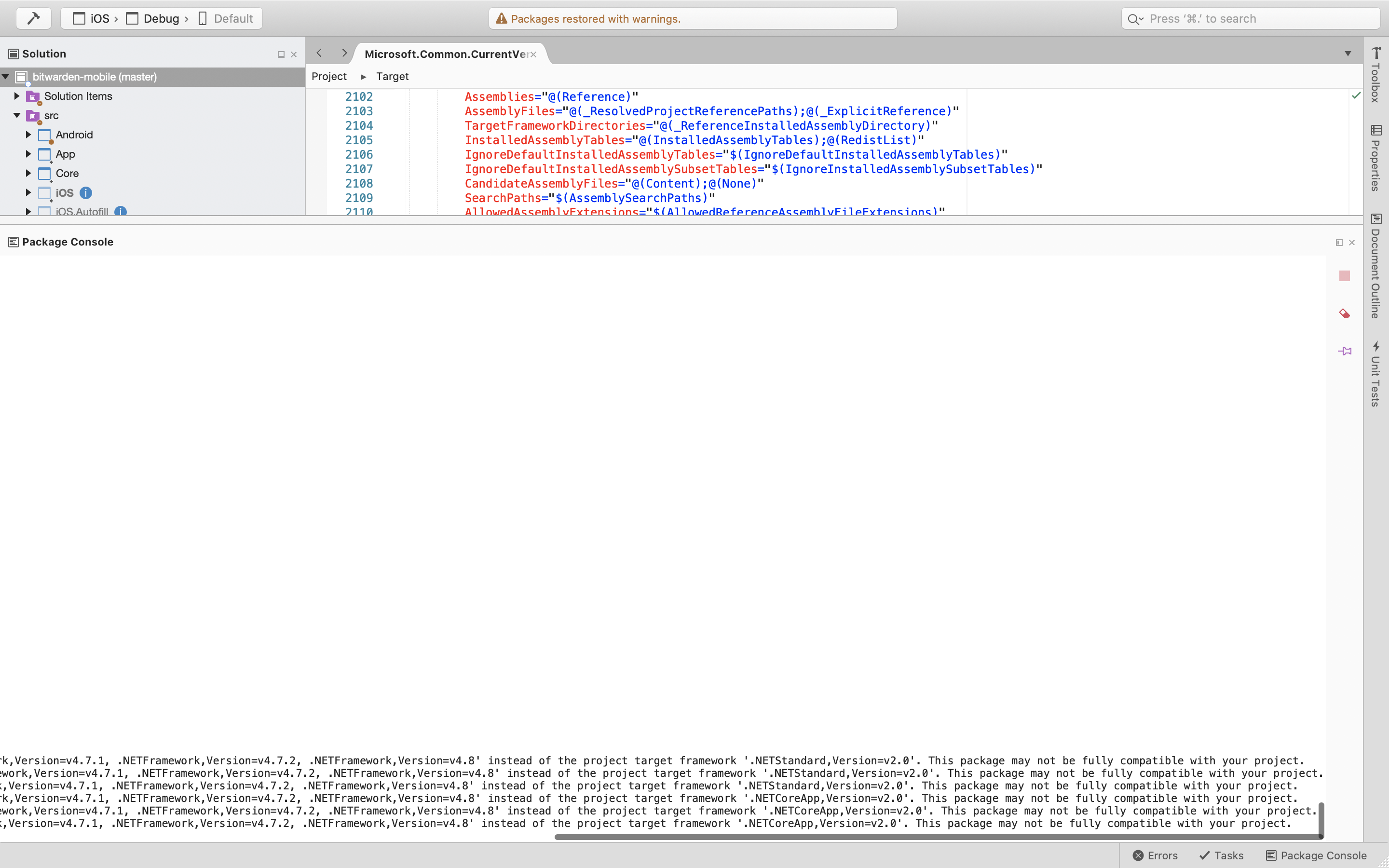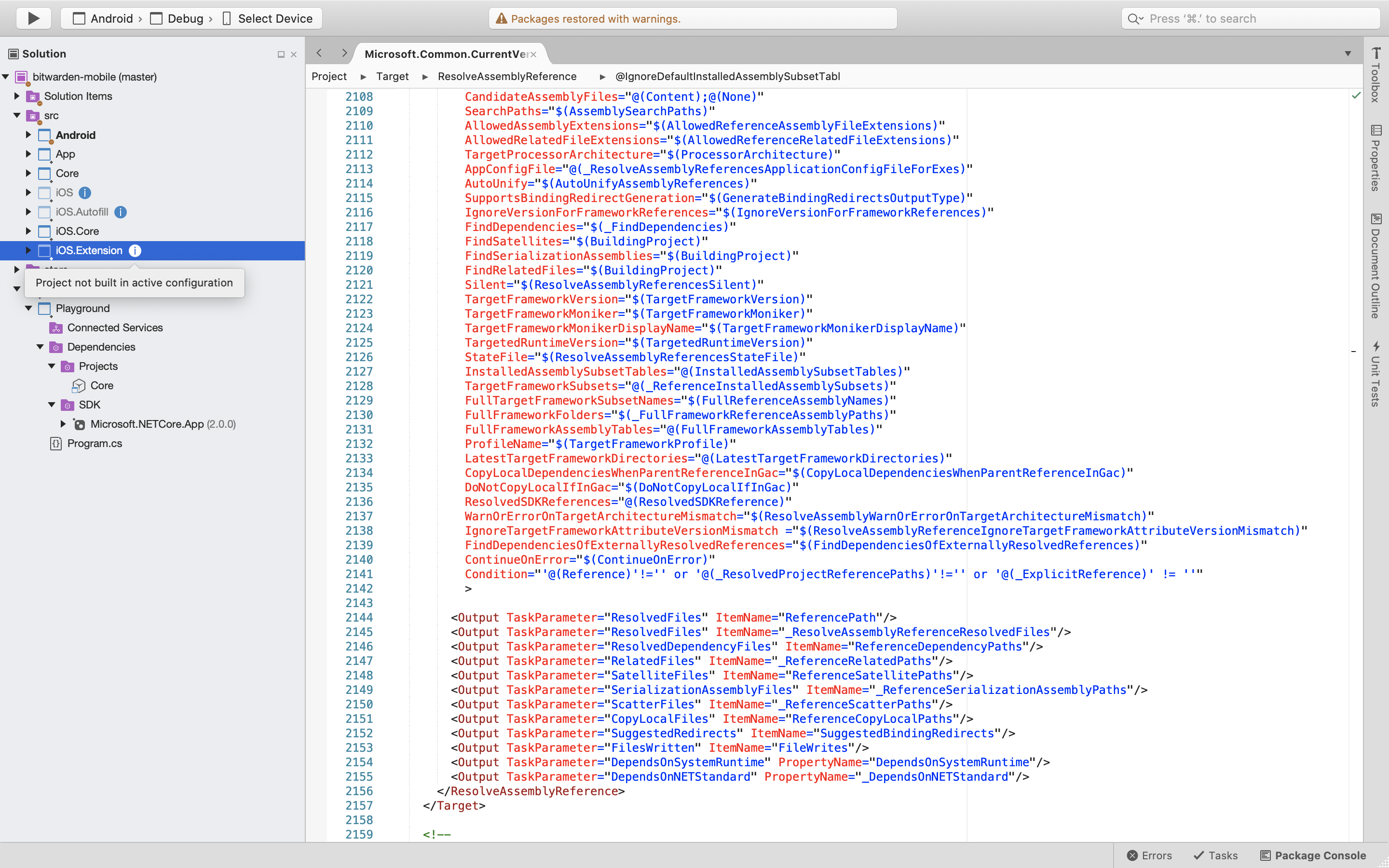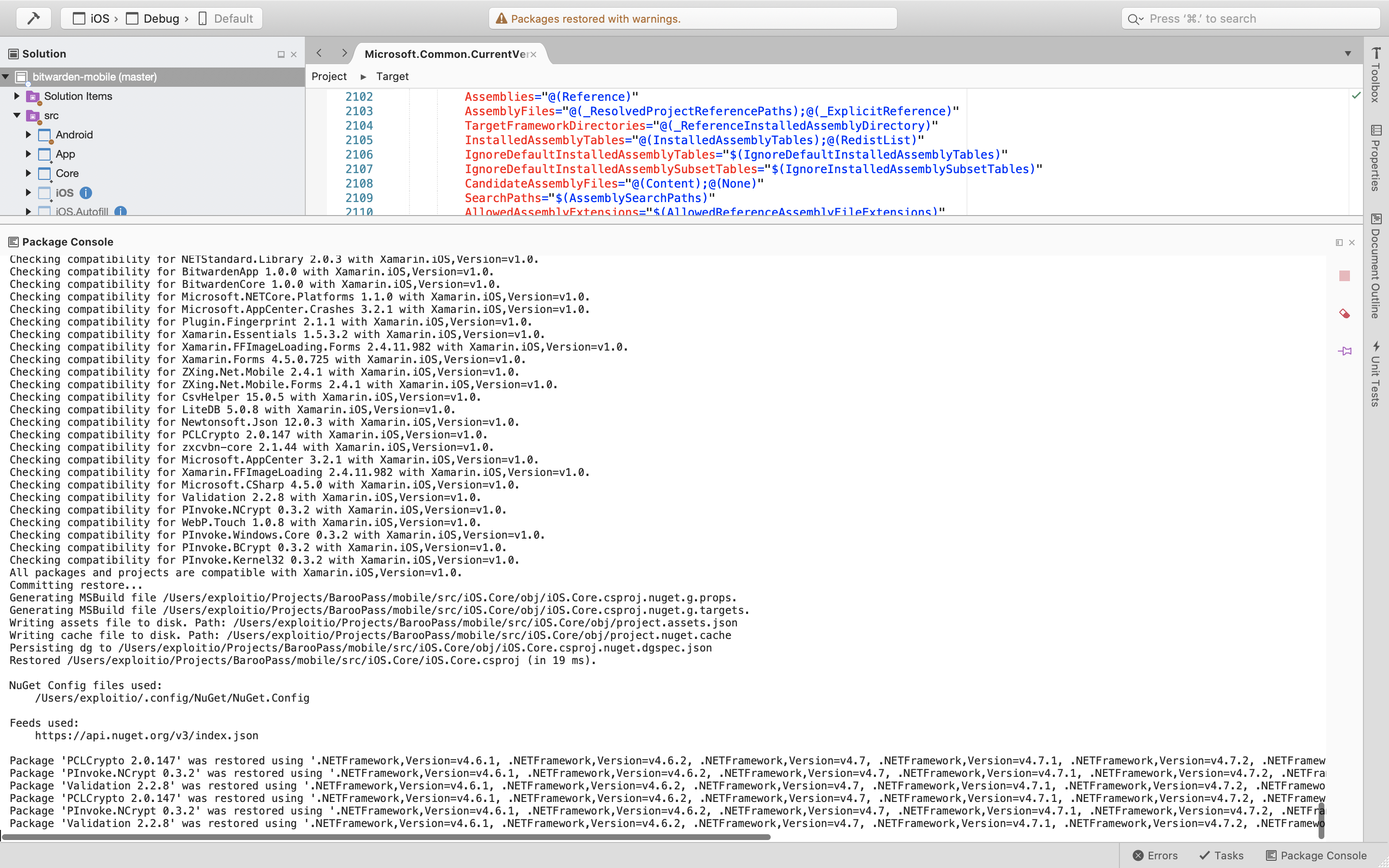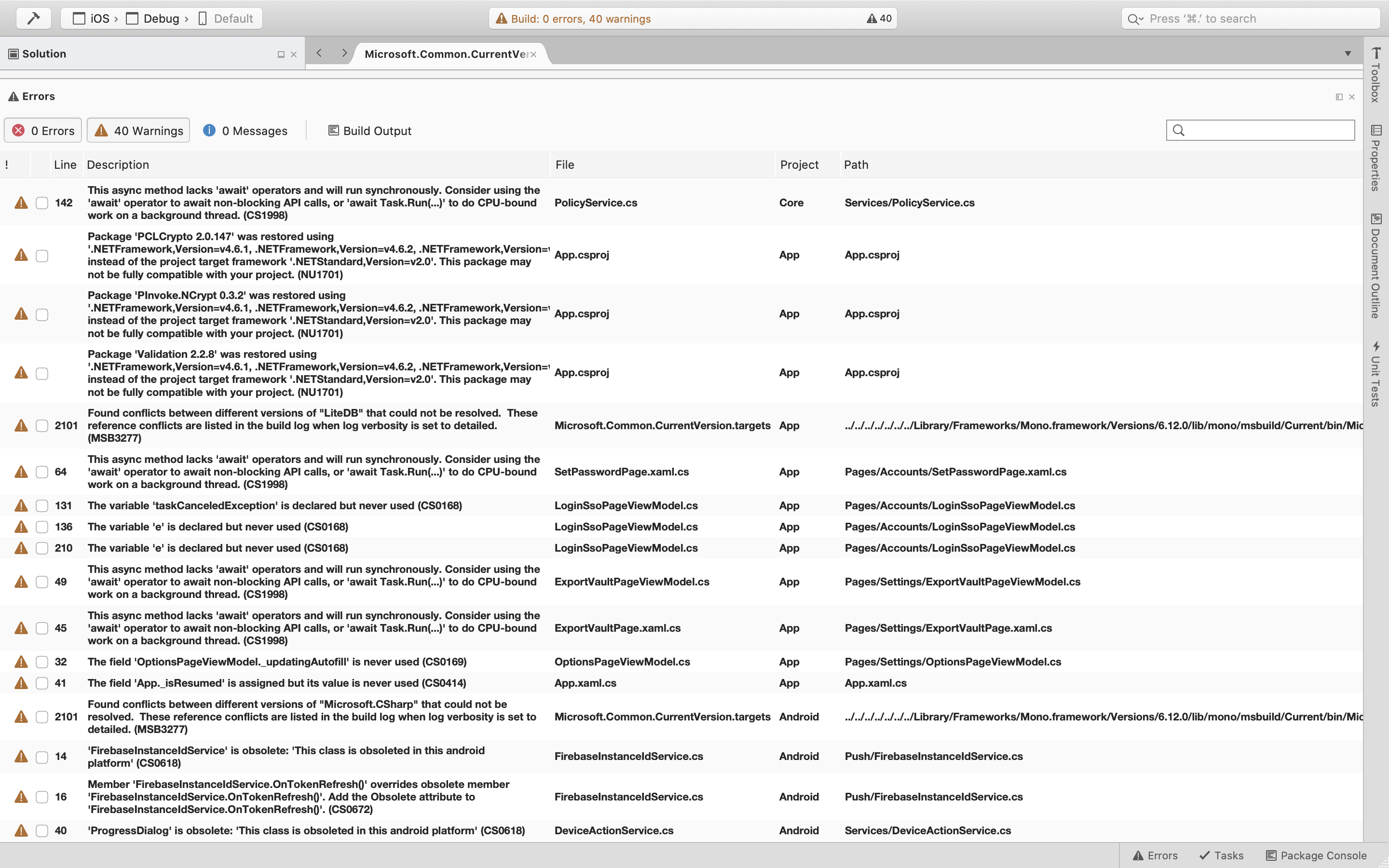 xcode 12, macos catalina, visual studio for mac 2019 with all packages installed!but in the build time I get following 40 warnings and the iOS does not get built.