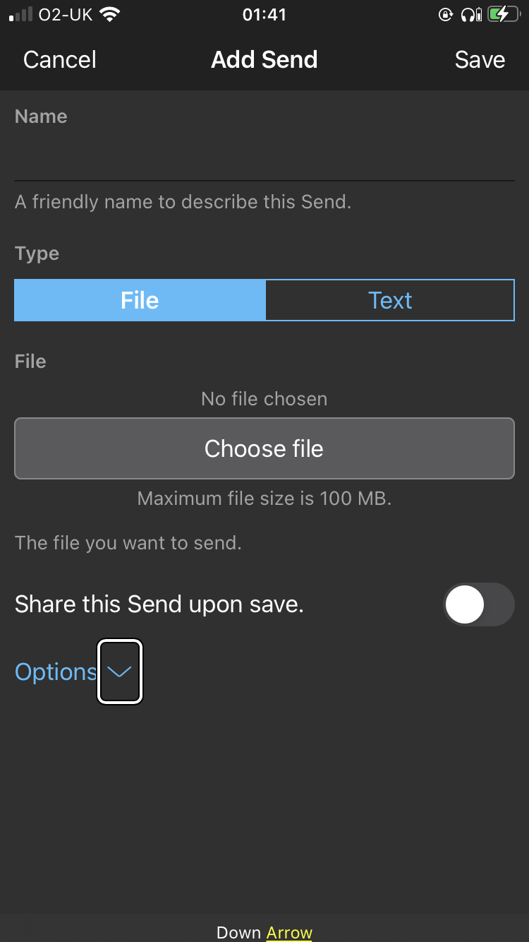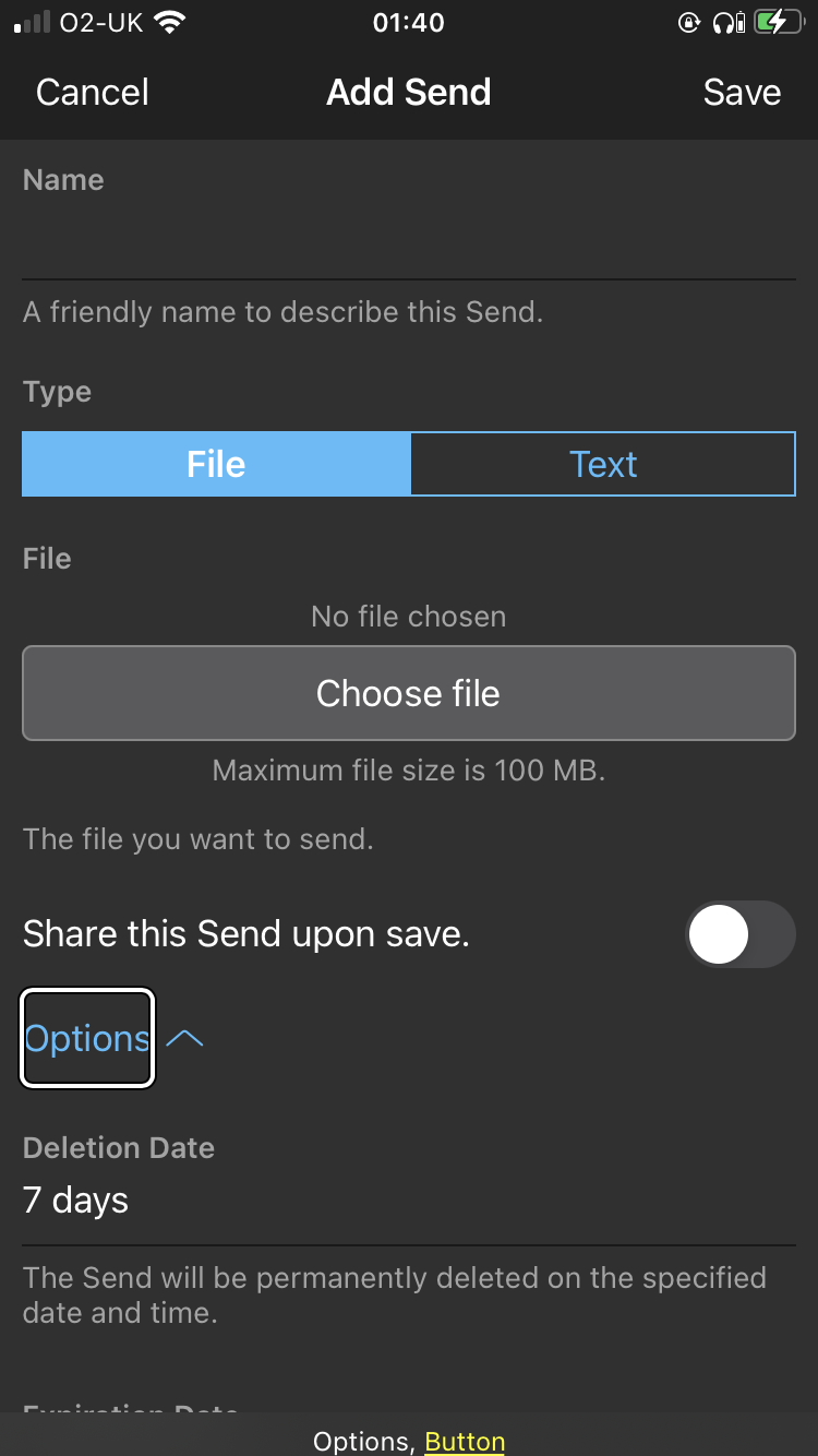 Further, the control is unnecessarily split into two - "Options" itself, and then the up/down chevron/arrow. The chevron button has an accessible name of just the icon, which is not announced - so the control is simply announced as "Button" - in iOS' case, VoiceOver then also announces "up arrow" or "down arrow" (as it uses extra heuristics to try and convey the unannounced button content), but not in the case of Talkback.