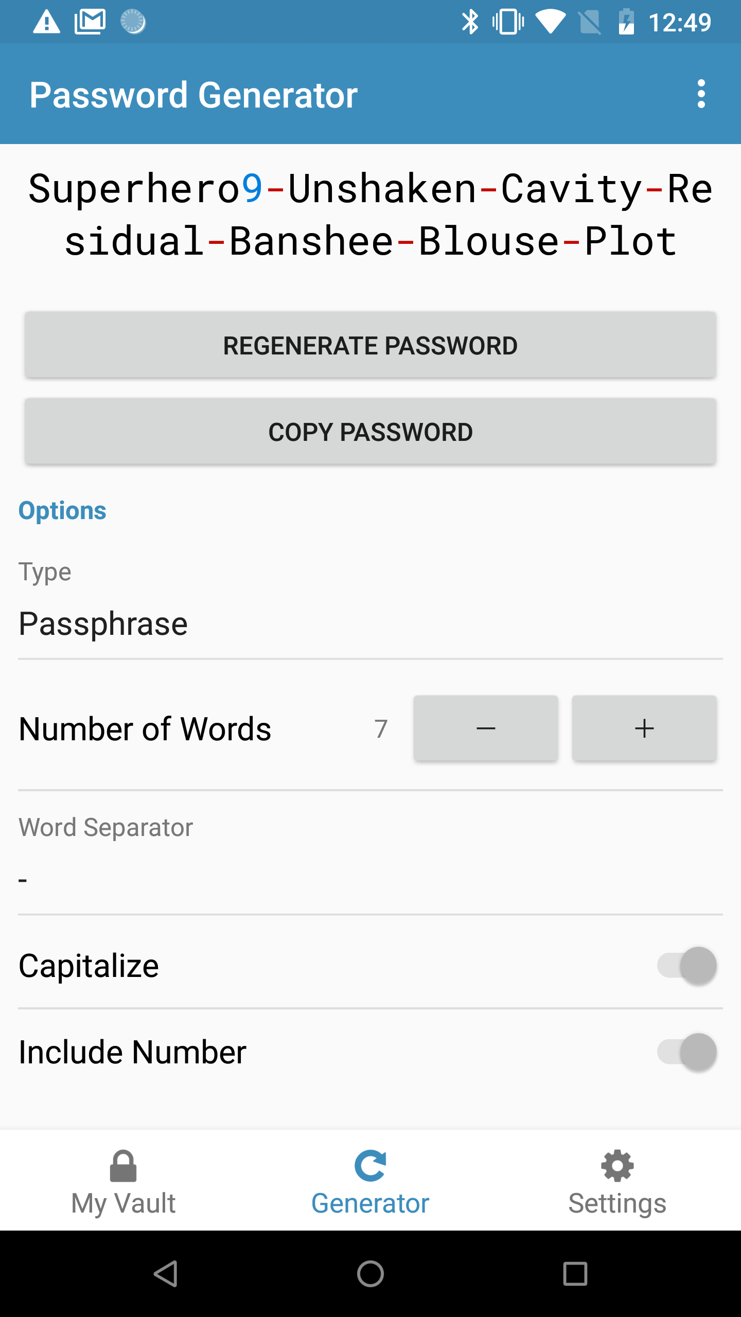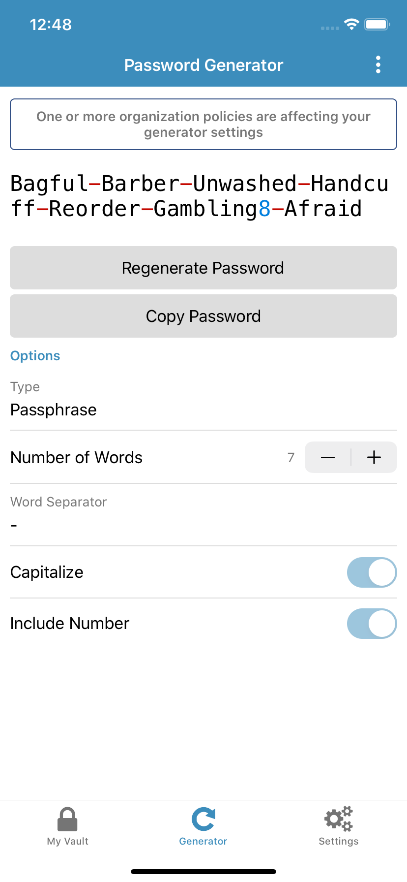 IsEnabledvalues forCapitalizeandIncludeNumberswitches depending on theEnforcedPolicyOptionsreturnedInEffect()functionPasswordGeneratorPolicyOptionsobjection creation. User options are now updated with passphrase options during retrieval. Normalize options will make sure the floor is set withMinNumberWordsvariable.Screenshots
