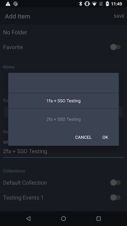 PolicyServiceto constructor. Added logic during construction of personal ownership list to remove the personal ownership option if necessary. Note: ran into a special use case where the list of collections was not being updated when defaulting to an organization because of the personal ownership policy. If theOwnershipOrgIndexremained at position 0, the change detection would not occur: Forced a refresh if specific condition met. Added check during submit to make sure the user didn't select personal ownership when not available.PersonalOwnershippolicy typeUsePoliciesUsePoliciesUsePoliciesScreenshots