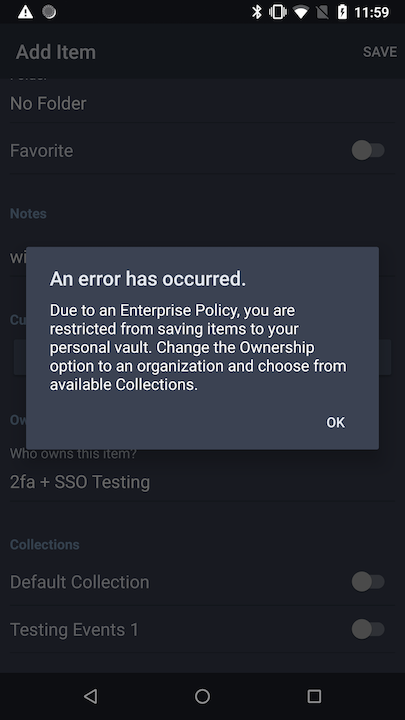 ced1a56Initial commit of personal ownership policy9a4502eUpdated logic for returning from allowing cipher creation from notification409fc09Merge branch 'master' into m-personal-ownership212bff4Merge branch 'master' into m-personal-ownershipe27cca1fixed small edge case when user in one org // adjusted error message to match all platforms916fff8Removed test code📊 Changes