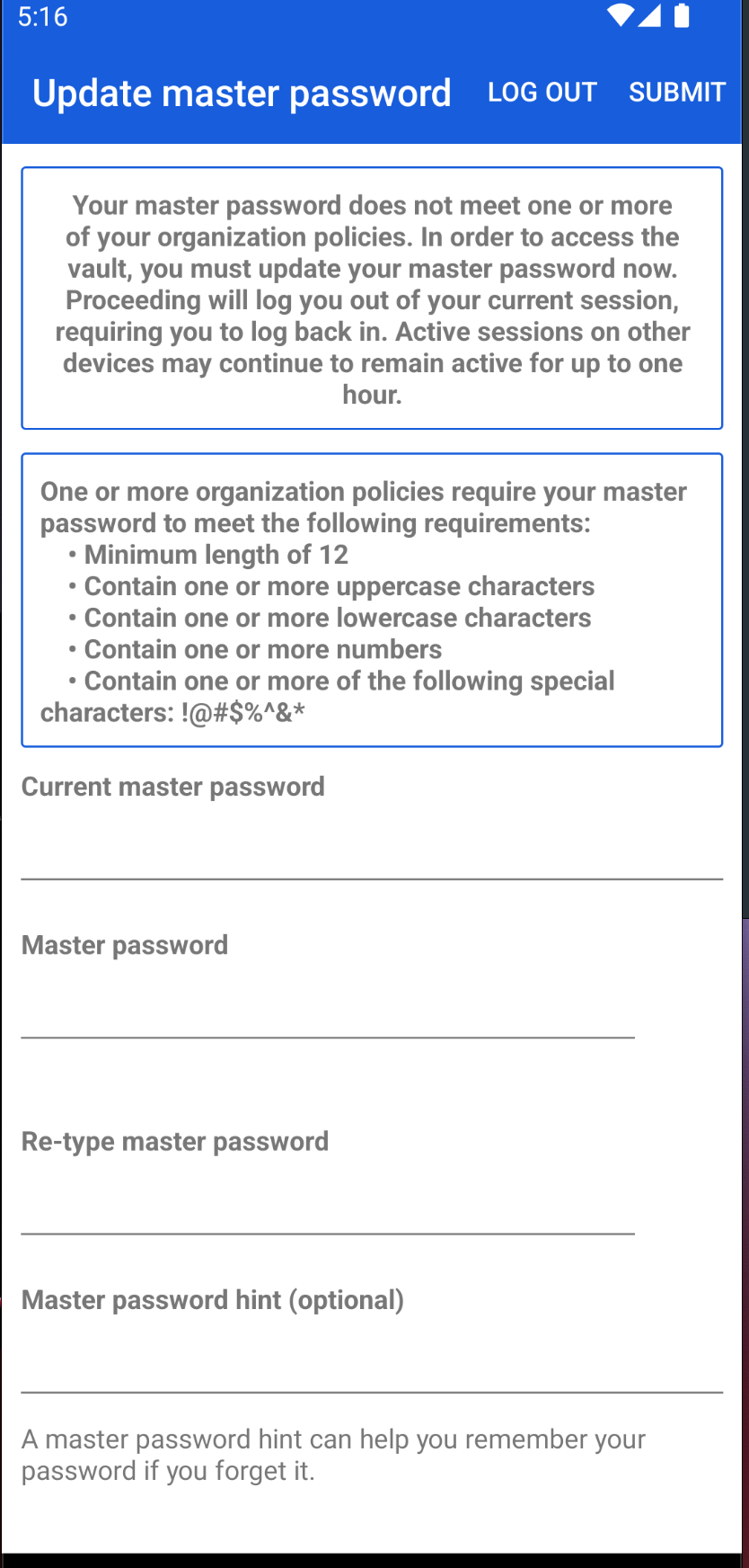 src/App/Pages/Accounts/UpdateTempPasswordPage.xaml: Update the warning text to depend on the reason for the password reset. Conditionally show a new "Current master password" field if updating a weak master password (not required for admin password resets)