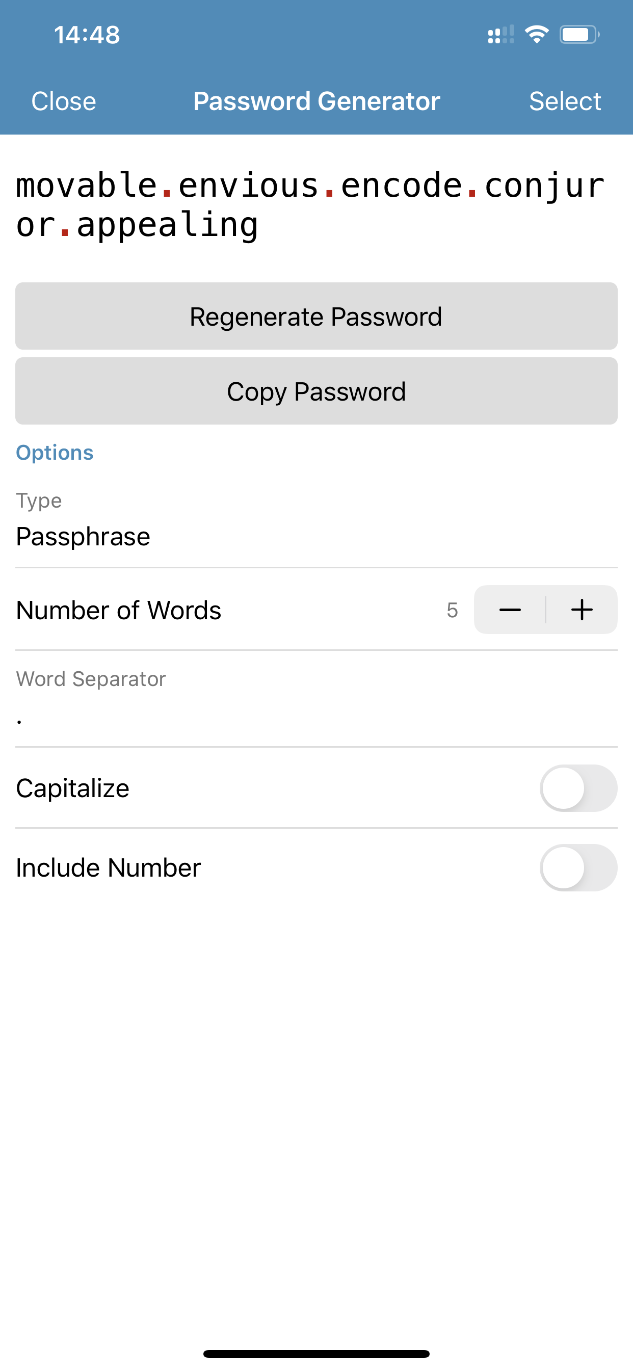 If you want to create an item in the vault when you use the iOS feature for password lookup in the browser/any application (the button over the keyboard which appears when typing in a password field), then Bitwarden does not give an option to generate a passphrase, only a regular password.