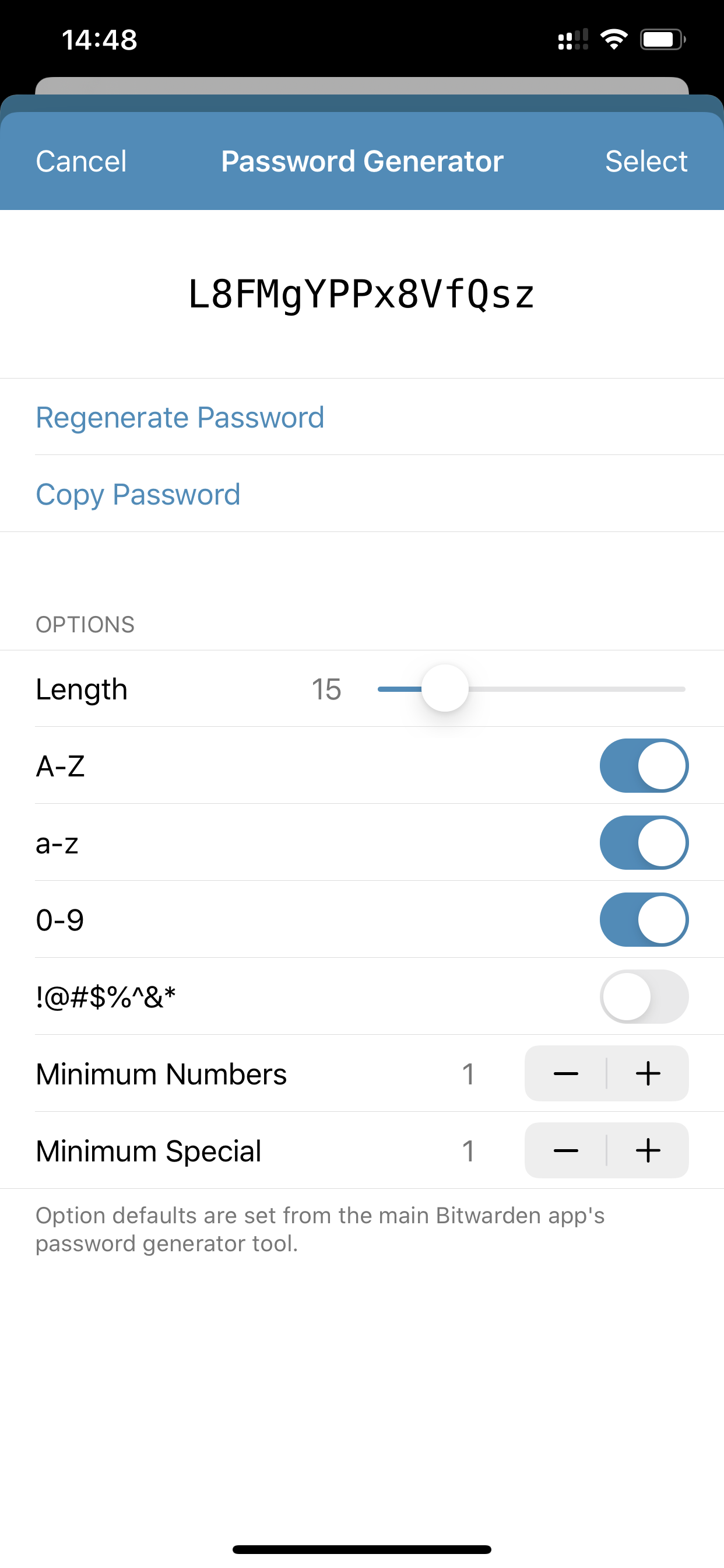 The message “option details are set from the main Bitwarden app’s password generation tool” hopefully means that this worked at one time?