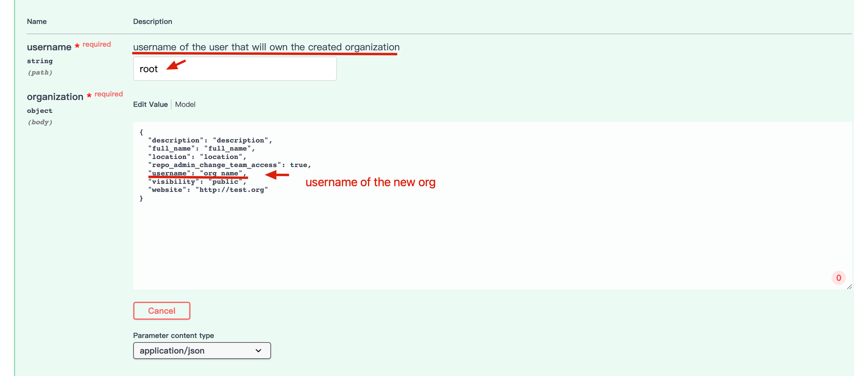 It would help the understanding of the API if the documentation references "username" in the payload as "the name of the new organisation".