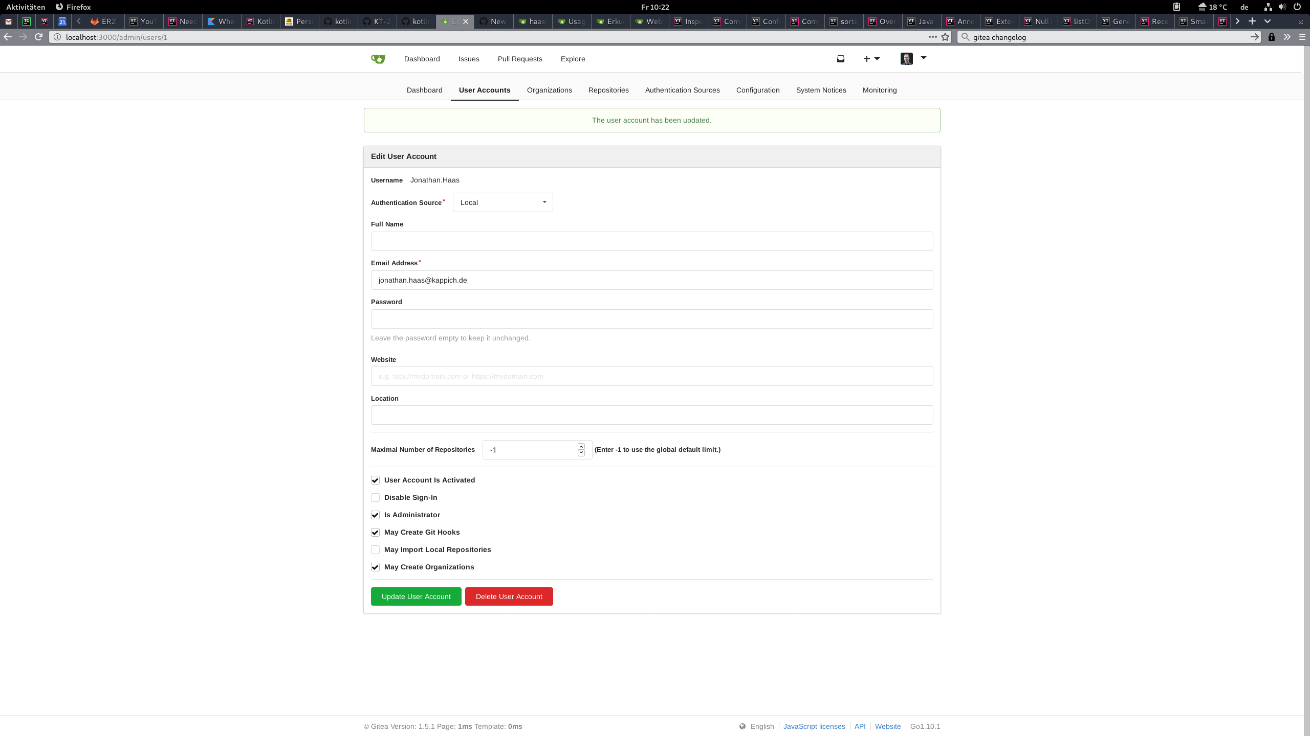 Checking "May Import Local Repositories" and clicking "Update user Account" causes the site to reload and it says "The user account has been updated" at the top, but the checkbox will reset to being unchecked and the user will still not be able to import local repositories.