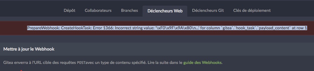 PrepareWebhook: CreateHookTask: Error 1366: Incorrect string value: '\xF0\x9F\x9A\x80\n...' for column `gitea`.`hook_task`.`payload_content` at row 1Screenshots
