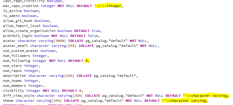 What I understand from those messages is when Gitea start, it check the database structure and if the definition does not match the expected one, the message is raised. The problem is that I can not change this because it is how PostgreSQL handle those default values. I saw three (3) issues from my environment (note that I tried to change the default values with pgAdmin GUI and command line to have the exact same as expected by Gitea).