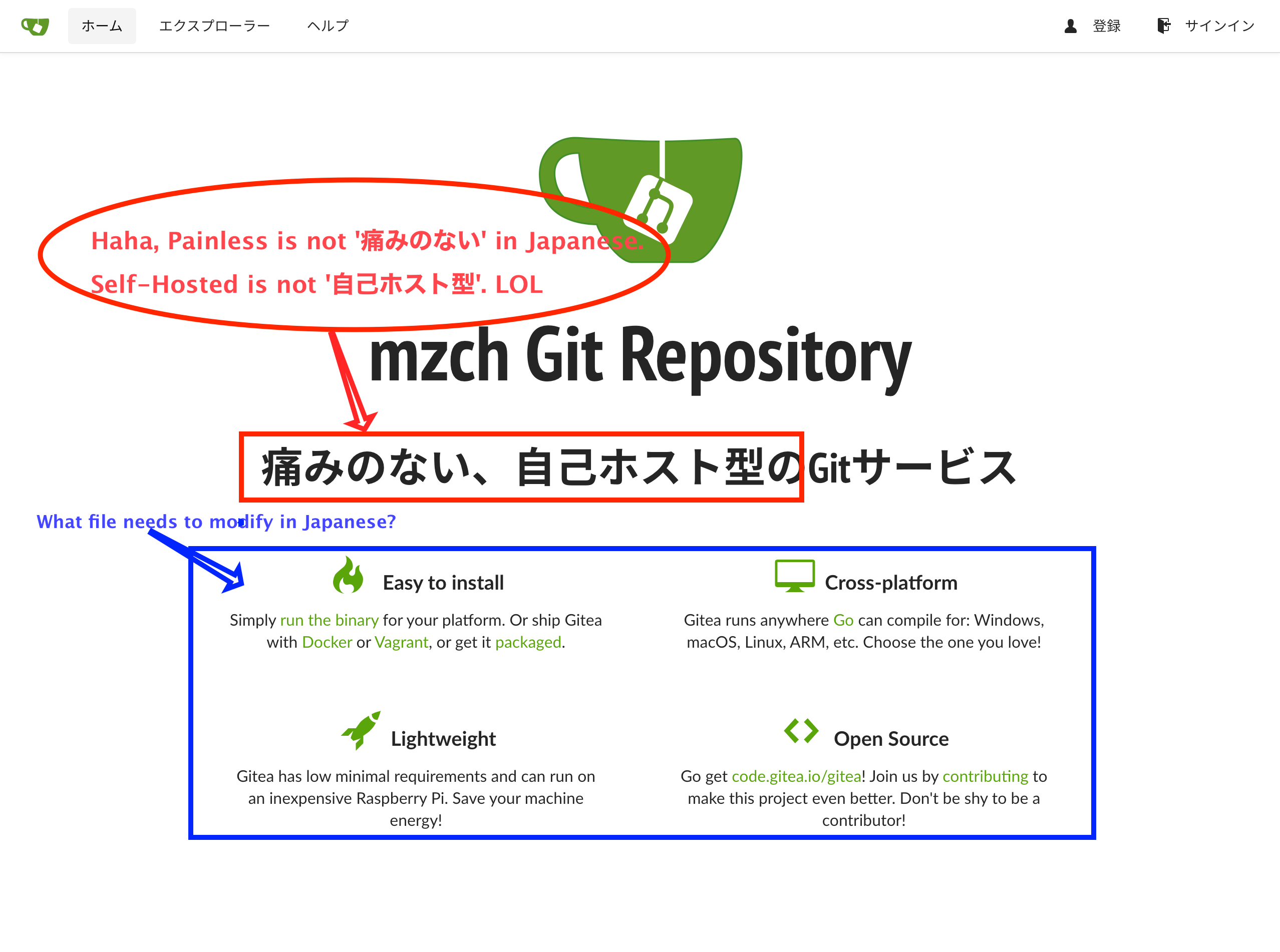 'A painless, self-hosted Git service' must be '手軽で簡単な、自分でホストする Git サービス'.