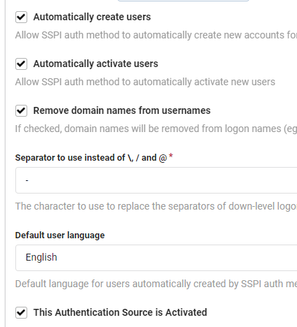 It's true there are few configuration options for SSPI in gitea, but some configuration is required in the AD environment (eg. creating a dedicated user account, setting spn on it, running gitea with this account, etc.) and the browser.