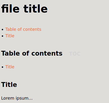 :TOC:is just a normal tag - i.e. no reason to modifygo-org) gitea can modify display of tags using cssspan.tags { ... }See my comment in https://github.com/niklasfasching/go-org/issues/44#issuecomment-748925565