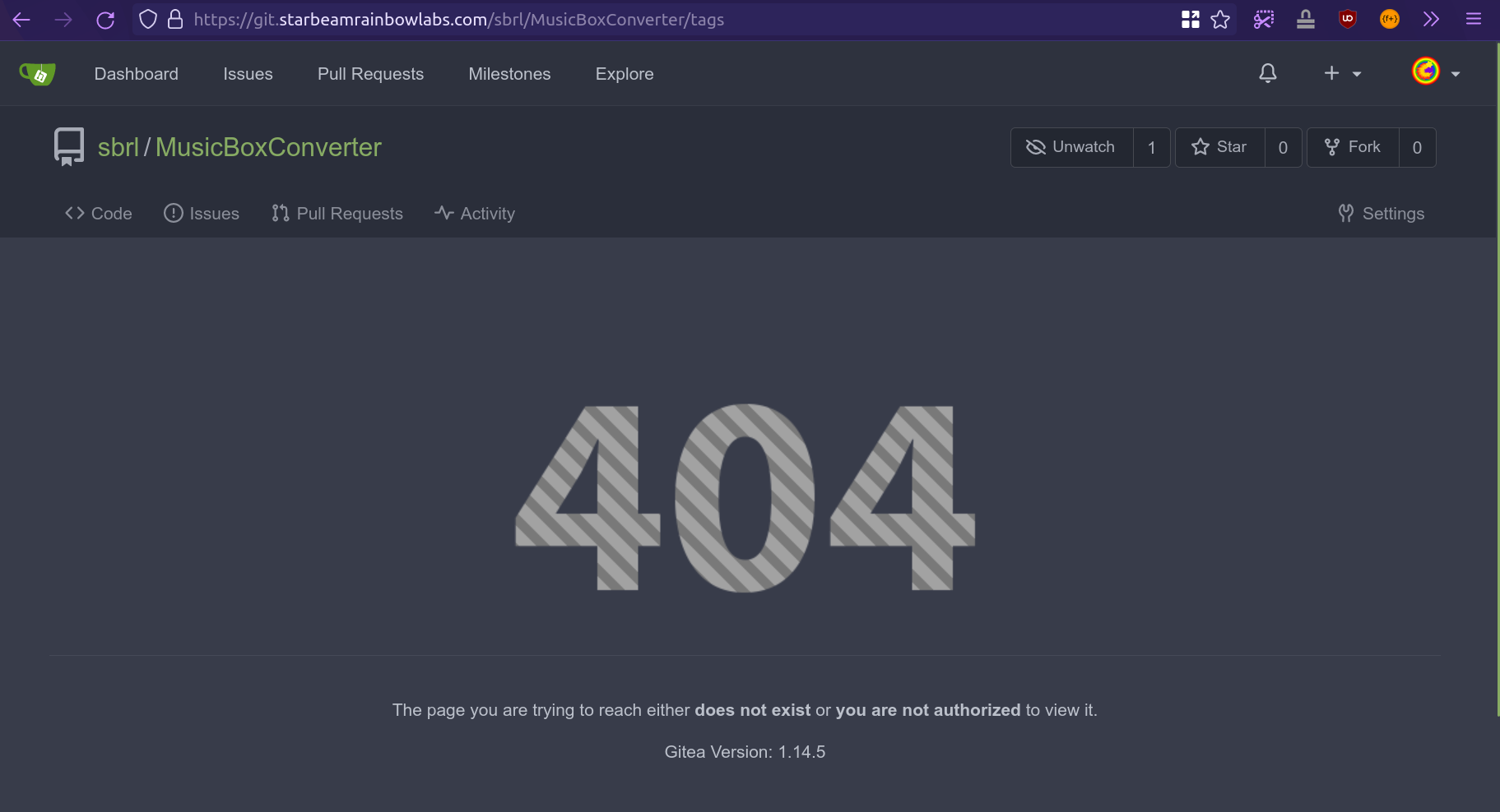 log2inapp.ini, restarting the instance, then hitting ENTER in the browser's address bar withhttps://MY.DOMAIN/MY_ORG/MY_REPO/tags.I should add that this behavior (the 404 error on the tags page) occurs with at least several repositories (did not try all of them), and other users of my Gitea instance (we're a small NGO) reported the same. The setup is a dockerized Gitea with a Postgres database. Has been running fine for a few years now.
