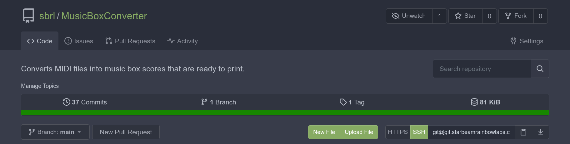 The top of the main page of a repository. Note that the releases tab is missing:
