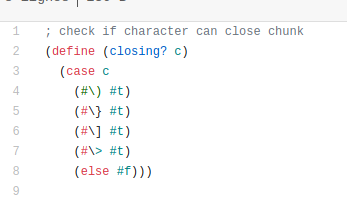 As can be seen on this screenshot taken from gitea demo site, #(, #[, #< and #{ should be displayed as one color, not seemingly random colors.