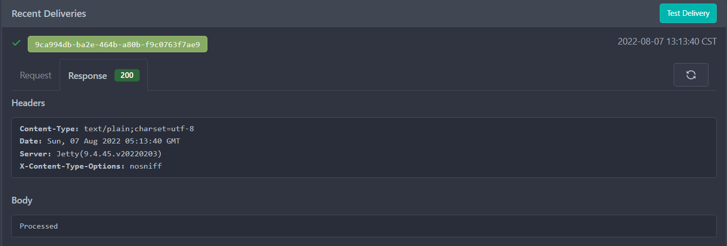 But I don't know why, I test delivery webhook in version 1.17.0 and it returns 200 response code with Processed string, but the Jenkins was not triggered and build automatically.