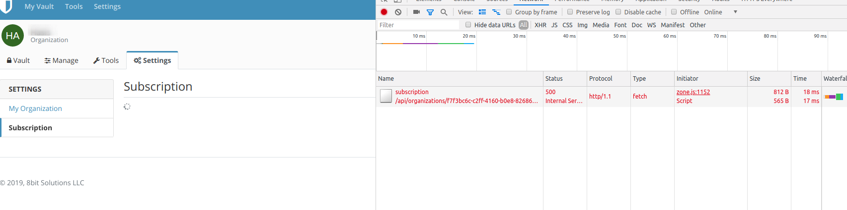 The error occurs whenever i want to switch to the subscriptions-tab inside the organization settings