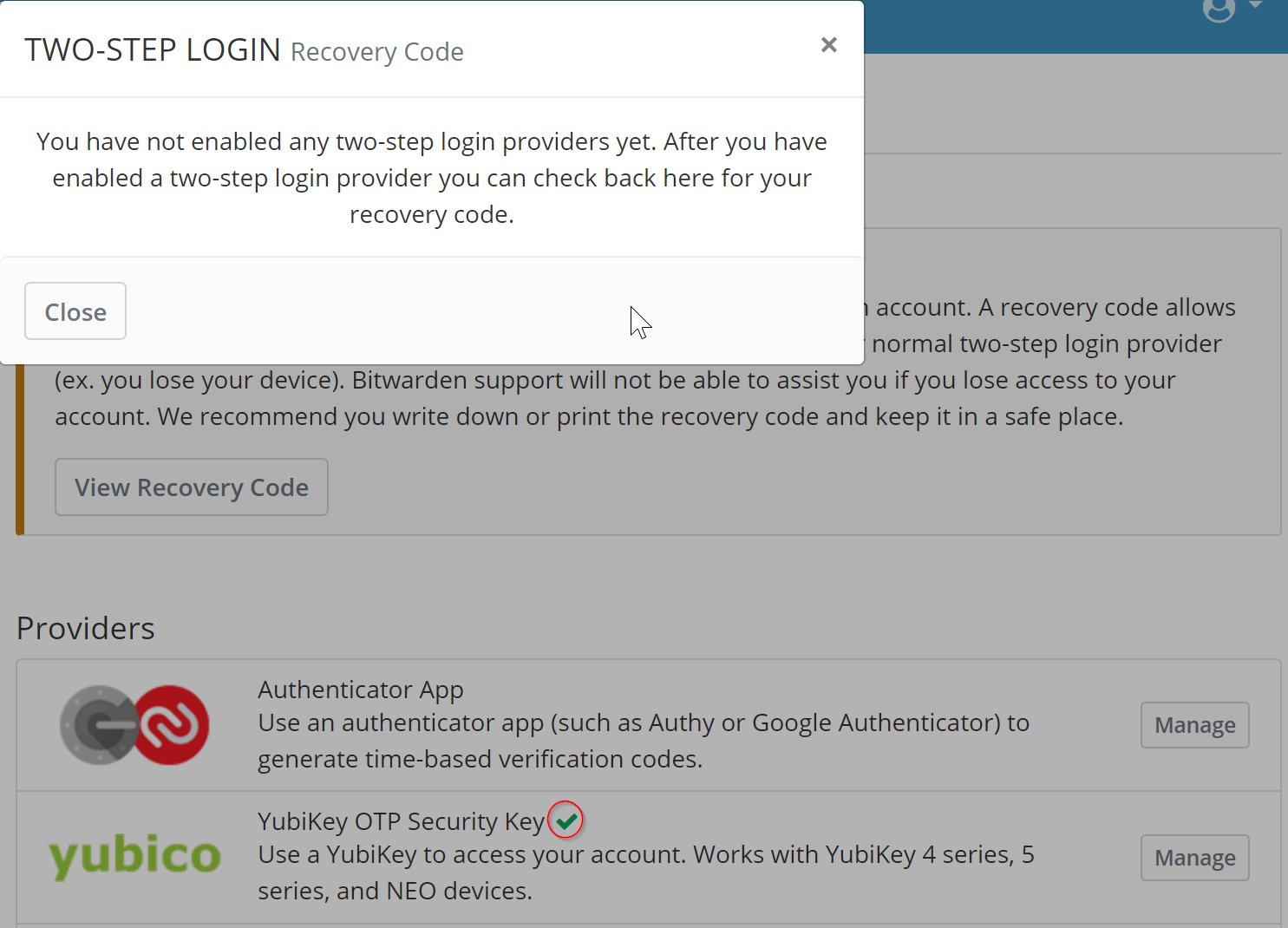 While configuring my account however I came across the issue that when enabling a YubiKey as the only 2FA method, the recovery key is not generated (see first screenshot) and can therefore not be used.