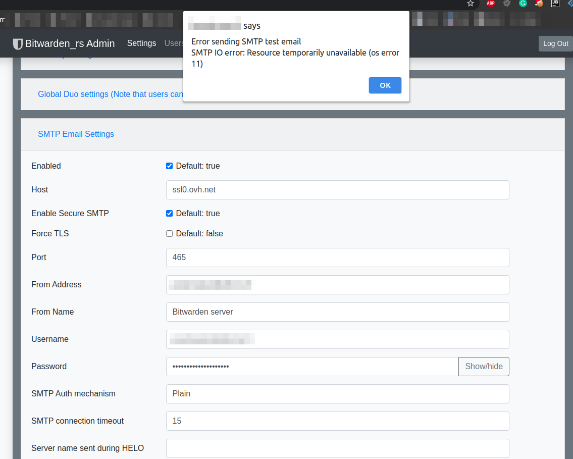 Server unable to send any email, I tried every possible settings, every time get the same error: