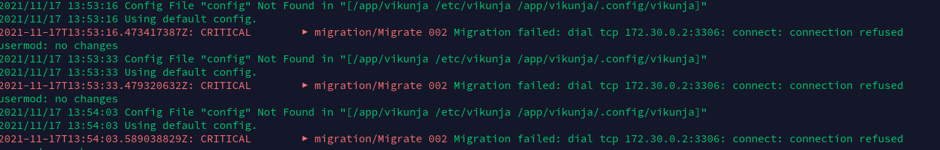 The Frontend and MariaDB container just start fine but the API doesn't, it's always restarting. In the logs I see that the error is