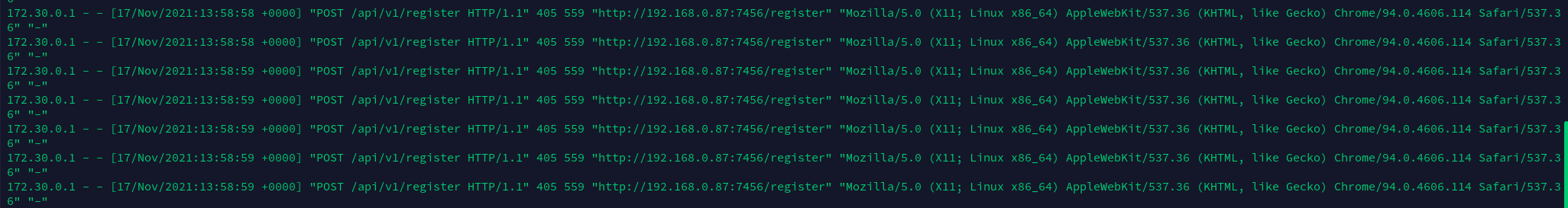 Ah, I forgot to mention that from the Frontend Docker, the logs show a 405 returned for the request to the API. That would mean that a POST was not allowed (tried to register) but at the same time that the DB container is accessible.