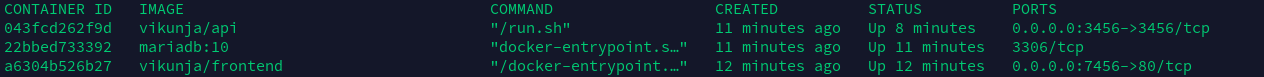 The problem is that with the provided docker-compose.yml from the docs the db user vikunja cant access the database, docker logs of the container show the error "Access denied for user 'vikunja'@'docker-ip' (Using password: yes)". If I exec into the container and log myself in (mysql -u vikunja -p) I get in just fine. The user vikunja isn't restricted from which host ('vikunja'@'%').